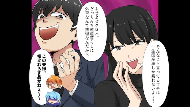 妹夫婦は「遺産暮らしに外車なんて無理なんだから」と言い、主人公夫婦をバカにして…。