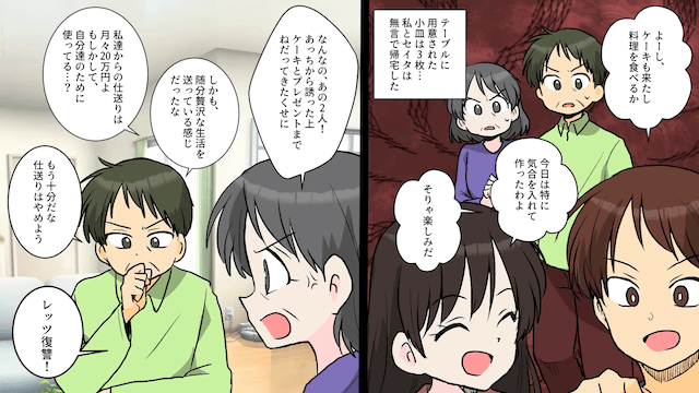 しかし数年後、主人公が仕送りの停止を告げると、長男夫婦は主人公夫婦を無視するようになり…。