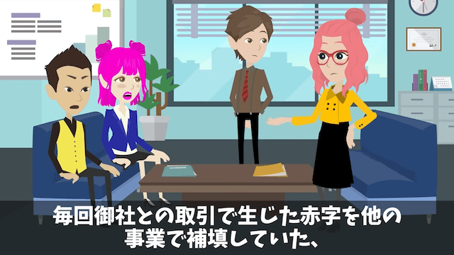 私情を挟むことをやめた主人公は、取引の撤退を決めました。 実は義両親の会社との取引は主人公の会社にほぼ利益がなかったのですが、親戚関係になるからと取引を続けていたのです。