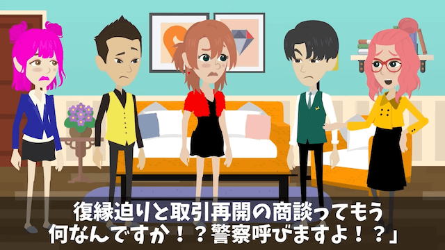 アポなしで主人公たちの家にやってきて、復縁と取引再開を求めてきた弟の彼女と義両親。 あまりに迷惑なため、主人公は「警察呼びますよ!?」と3人に伝えます。