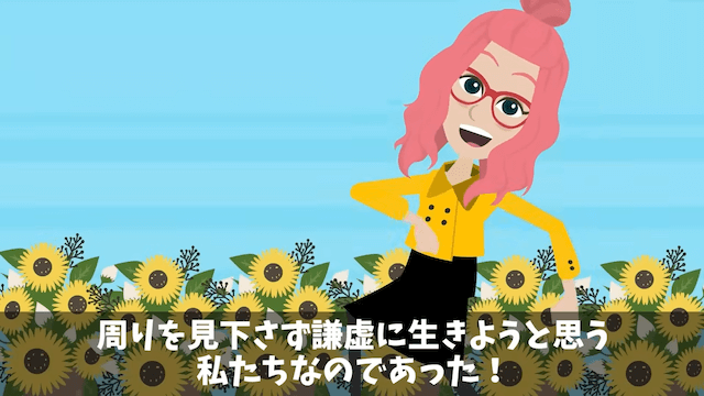借金をして悲惨な状況に陥ってしまった義両親と弟の彼女は、これまでの行動を後悔します。 そしてそんな3人を見て、周りを見下さずに謙虚に生きようと決めた主人公なのでした。