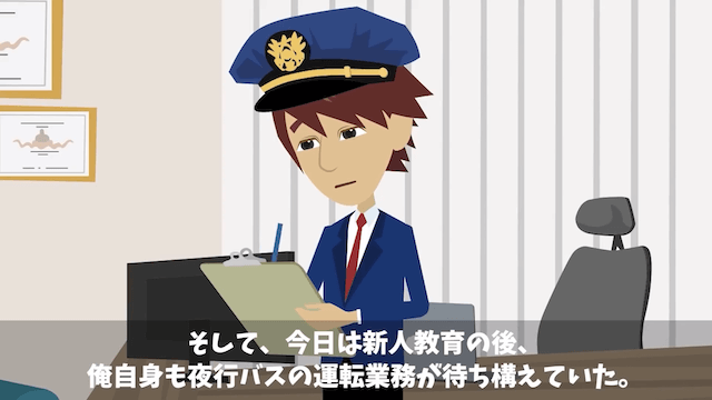 後輩に運転するときの注意事項を教え「悲しい事故を絶対になくさないといけない」と伝えた主人公。 その後、主人公は今日の運転業務のため、バスの点検と清掃をします。