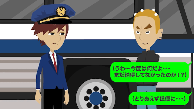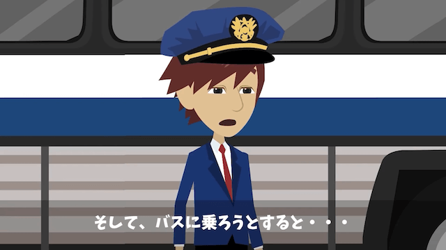 女性客がバスに戻ってきたため主人公が清掃完了を報告すると、女性客は何度も主人公に感謝の言葉を伝えてくれました。 その後、主人公がトイレに行って戻ってくると、なんと男性客が乗降口で仁王立ちしていて…。