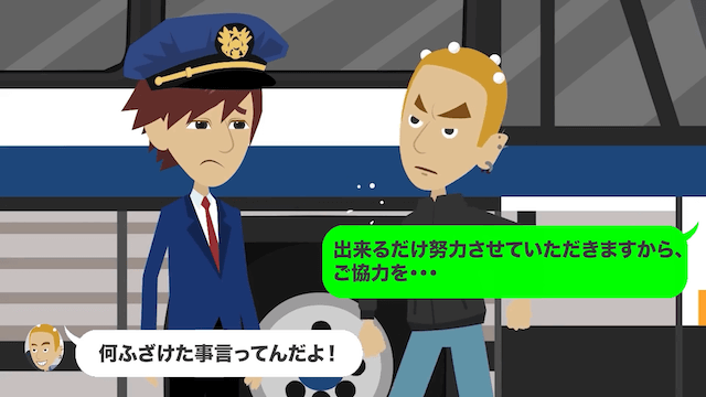 主人公が男性客に声をかけて予定が変わったことを謝罪すると、男性客は逆上して主人公の胸ぐらをつかんできました。 主人公が「乱暴はおやめください」と冷静に対応するも、男性客は乗車代金の返金を要求し「SNSに拡散するぞ!」と脅してきて…。