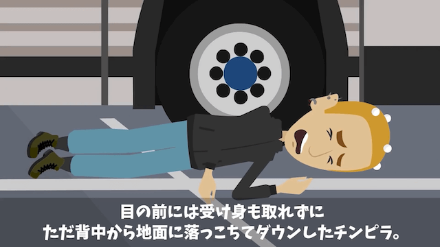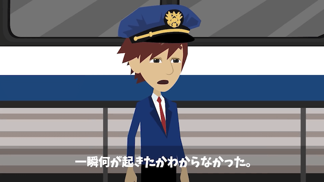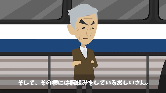 高齢男性客が男性客に注意すると、怒った男性客は主人公と同じように高齢男性客を突き飛ばそうとしました。 しかし次の瞬間、男性客は地面に倒れ、その横で高齢男性客が腕組みをしていたのです。