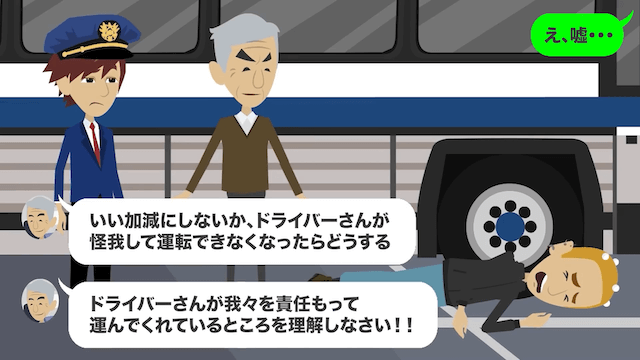 今回は『高速バスで…男が「運転手がトイレ休憩なんてサボりだ!」と乗車代金の返金を求めてきた話』を紹介します。 高齢男性客を突き飛ばそうとした男性客は、突然悲鳴をあげ、地面に倒れこみました。 その横では、高齢男性客が腕組みをしていて…。