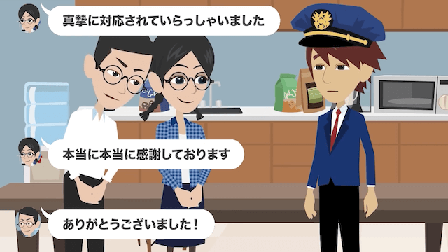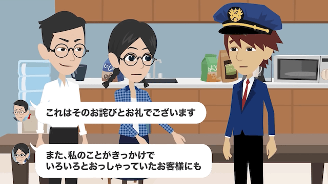 後日、主人公が仕事をしていると、女性客とその夫が主人公に会いにきました。 そして2人は主人公に感謝を伝え、お詫びとお礼の品を渡してくれたのです。