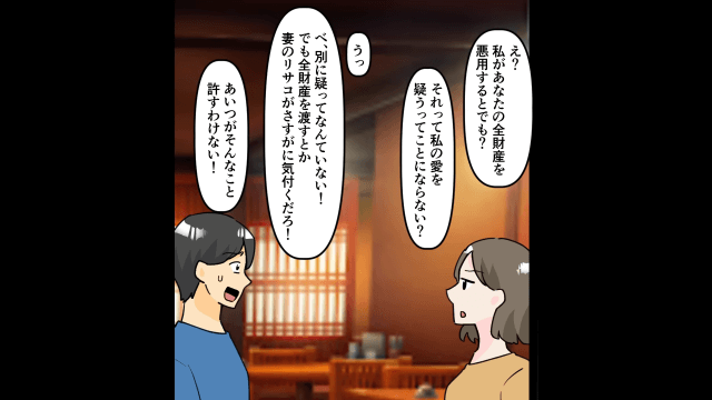 主人公からの条件を受け入れた後、浮気相手と作戦会議をし始めた夫。 しかし浮気相手は夫を騙してお金を搾り取るつもりで「隠し子にあなたの全財産を譲ってくれない?」と言ったのです。