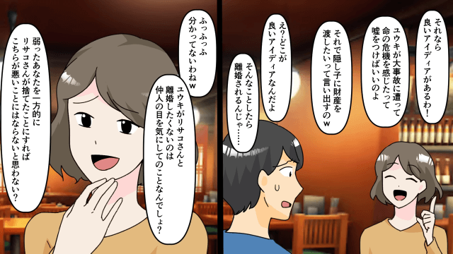 さらに浮気相手は夫に「あなたが大事故に遭って命の危険を感じたって嘘をつけばいいのよ。それで隠し子に財産を渡したいって言い出すの」と言い、夫が仲人の上司から悪者扱いされずにスムーズに離婚するための作戦を企てて…。