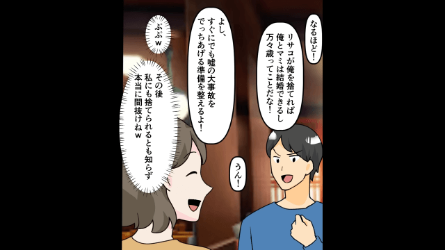 今回は『大事故に遭った夫「俺の財産すべて隠し子に渡す」私「じゃあ離婚で」⇒嘘つき夫の末路』を紹介します。 夫を騙してお金を搾り取るつもりだった浮気相手は、夫に「隠し子にあなたの全財産を譲ってくれない?」と言いました。 さらに浮気相手は「あなたが大事故に遭って命の危険を感じたって嘘をつけばいいのよ。それで隠し子に財産を渡したいって言い出すの」と言い、夫が会社で悪者扱いされずにスムーズに離婚するための作戦を企てて…。
