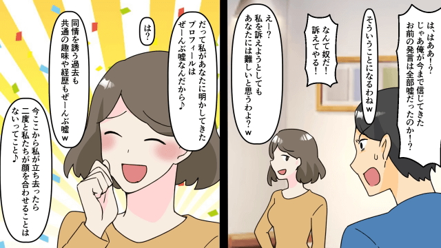 夫から家や車のローン返済に協力するよう求められた浮気相手は「なんで財産を譲られた側の私がお金を支払わなきゃいけないのよ!?」と激怒し、別れを宣言しました。 さらに浮気相手は自分のプロフィールや妊娠がすべて嘘だったと明かし、動揺する夫を置いてその場から立ち去ったのです。