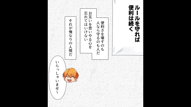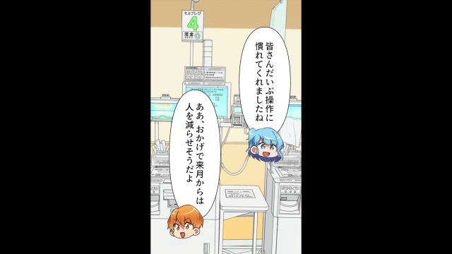 以前セルフレジに苦戦していた男性客が今ではすっかり使いこなし、セルフレジが定着してきたことを実感する主人公と従業員。 そして主人公は、今回の一件でお互いを思いやる心を忘れてはいけないと改めて思ったのでした。