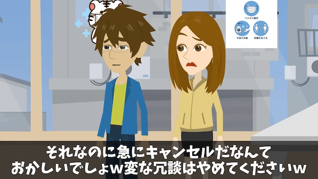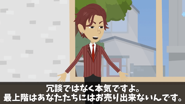 主人公は戸惑いつつも「俺たちちゃんと契約しましたよね?」と営業マンに言い、今の家が解約済みで突然のキャンセルは困ると伝えました。 しかし営業マンは、最上階は売れないと言い続けて…。