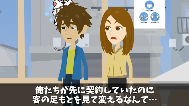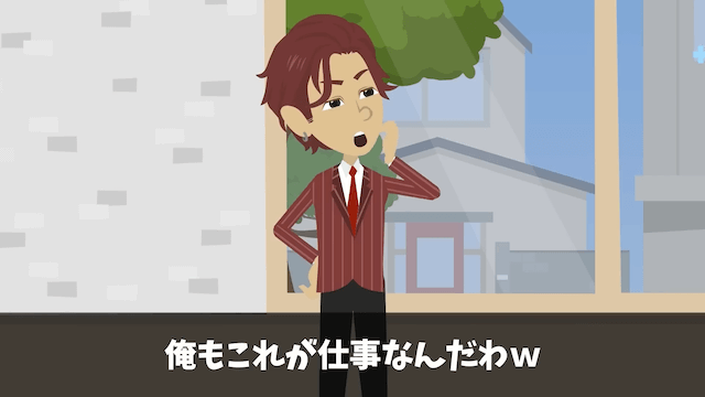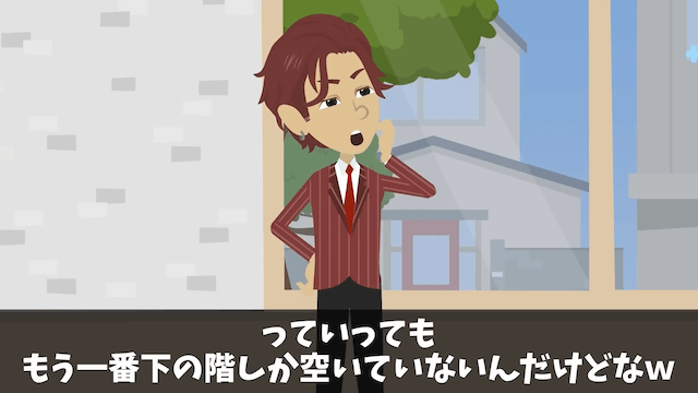 営業マンは最上階を購入した客が主人公よりお金持ちだと言い、主人公が最上階に住むのは分不相応だとバカにしてきました。 そして最上階を諦めるよう言ってきたため、主人公は「なんだよそれ…」と不満を漏らしたのです。