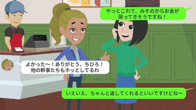 幹事たちに怒られて観念した同級生ですが、その日の飲み会費を全額払うにはお金が足りず、少しずつ返済していくことになりました。 そして主人公と先輩は「やっとこれで、彼女からお金が戻ってきそうですね!」「他の幹事たちもホッとしてるわ」と話していて…。