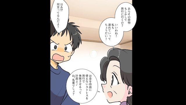 今回は『元義母「介護費の入金はまだかしら?」というので真実を伝えた結果』を紹介します。 主人公夫婦が用意した旅行の荷物を見て「私も連れていってちょうだい!」と言い出した義母。 夫はそんな義母に「なに言ってるんだよ!」と怒りますが…。