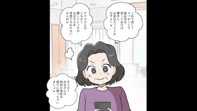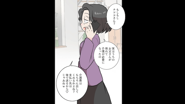 義母の浪費癖に我慢の限界を感じ、家を出ていった義父。 そしてお金に困った義母は「お父さんが倒れて介護が必要になったの」と嘘をつき、主人公夫婦にお金を要求するのでした。