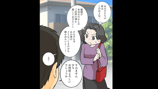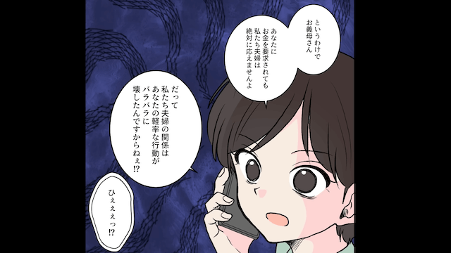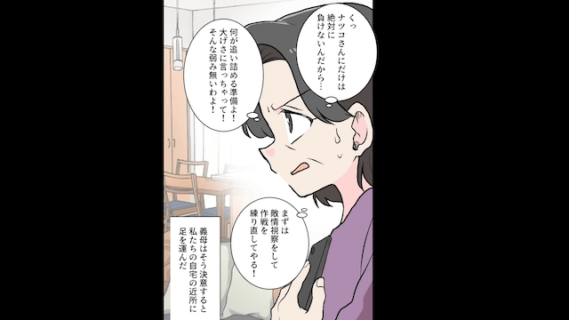 振り込みを催促してきた義母に離婚を報告し「私たちの幸せを壊したあなたを絶対に許しません」と告げた主人公。 すると義母は「絶対に負けないんだから」と主人公に対抗心を燃やし、主人公夫婦の様子を伺うために家の近所までやってきたのでした。