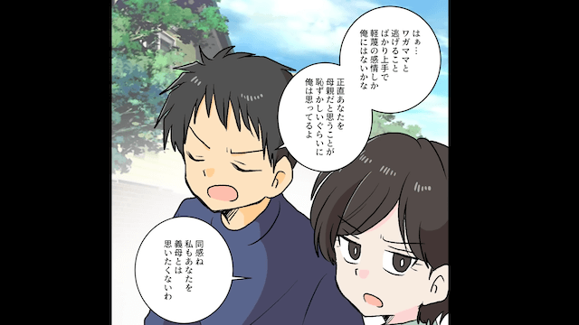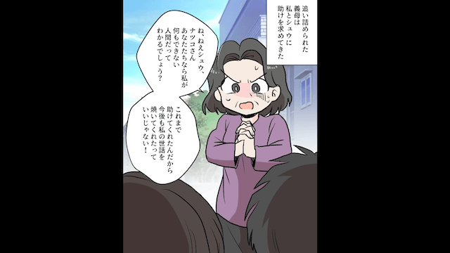 主人公夫婦は義実家を出た義父と同居を始めていたため、義母の嘘に最初から気づいていました。 周囲に迷惑をかけたことで義父に激怒された義母は、主人公夫婦に助けを求めてきます。