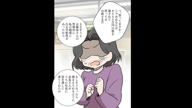 追われる立場になって主人公を逆恨みした義母は、翌日、主人公のクビを求めて会社で大騒ぎしました。 しかし義母はすぐに取り囲まれ、その場にはつぼを壊されて激怒している会長もいたのです。