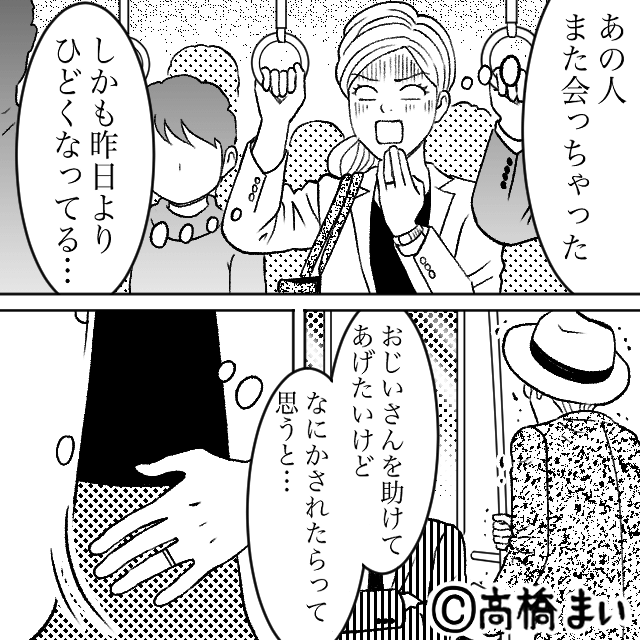 翌日、再び男性と会ってしまった主人公。 男性は優先席に座ろうとしている老人を押しのけ、昨日よりもひどい行動をとっています。