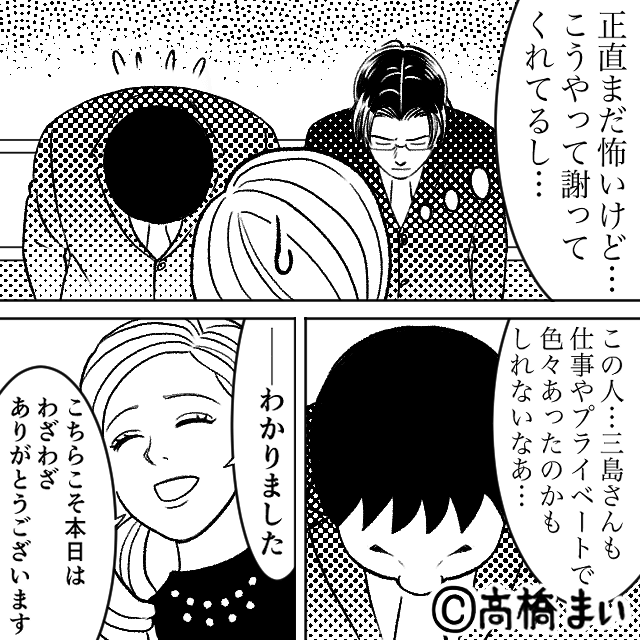男性の上司から直接謝罪をしたいというメールが届き、数日後、男性と上司に会った主人公。 男性は今回の件で異動が決まったようで、主人公に謝罪をしてきます。