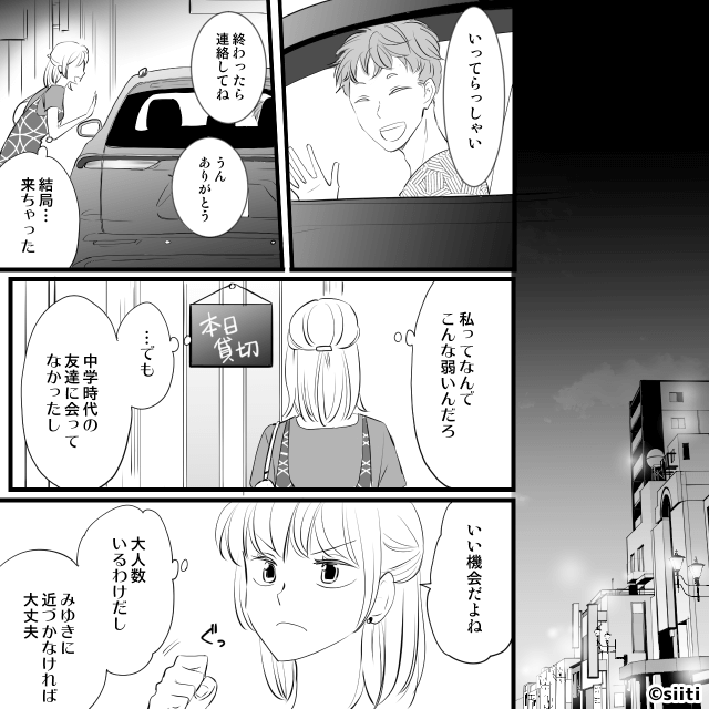 同級生から嫌がらせを受けていたことを、親以外には話していなかった主人公。 婚約者に同窓会の話をすると、なにも知らない婚約者は「いいじゃん行ってくれば?」と参加を勧めてくれます。