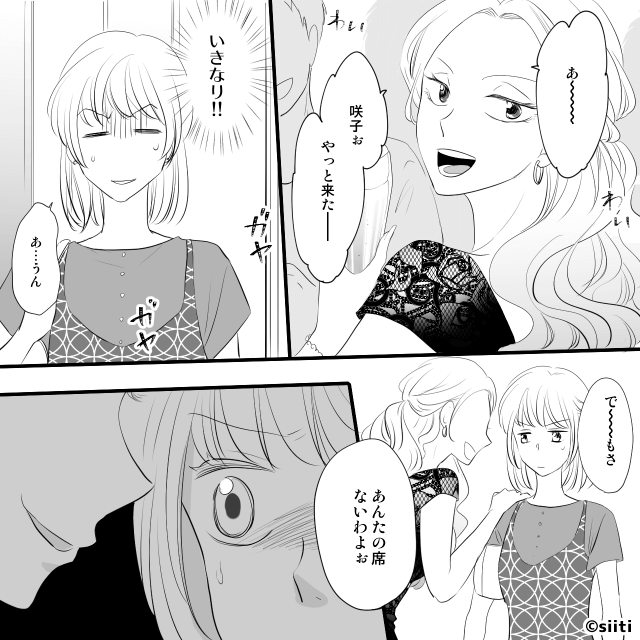 婚約者にバレたくなかった主人公は同窓会に参加するのですが、店に入った瞬間、同級生に「あんたの席ないわよ」と言われ…。