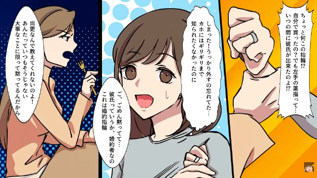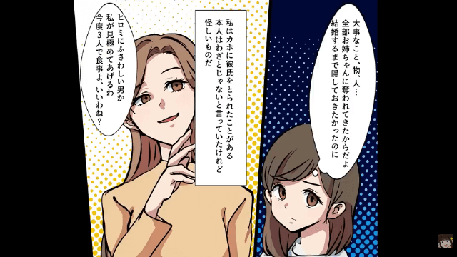 以前にも姉に彼氏をとられたことがある主人公は、姉に苦手意識を感じ、婚約者の存在を黙っていました。 しかし主人公は姉に婚約指輪を見られてしまったこともあり、また別の機会に婚約者を紹介することになったのです。