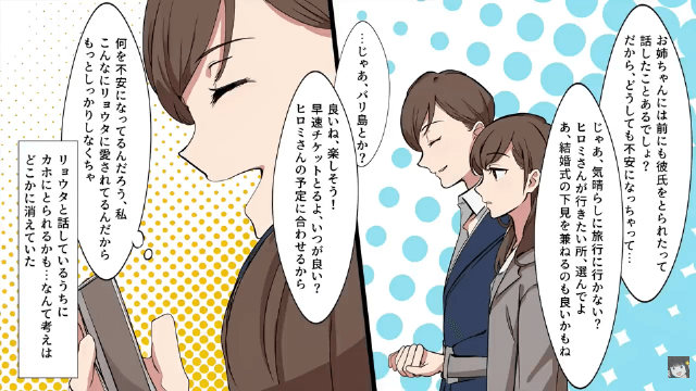 今回は『私の婚約者を寝取った姉「彼の子ども妊娠しちゃった!」私「彼とは海外旅行中だけど?」⇒勘違いしていた姉の末路』を紹介します。 姉は婚約者が主人公の勤めている会社の社長であることを知ると、熱い視線を送り、何度もしつこく連絡先を聞いてきました。 そして姉から婚約者へのアプローチに不安を感じていた主人公は、絶対に婚約者を渡さないと心に決めたのですが…。