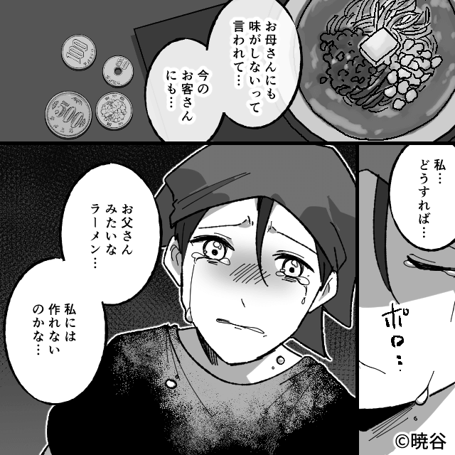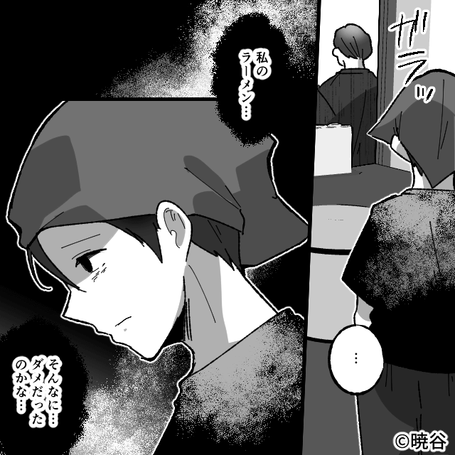 ラーメンを食べた男性客は怒り始め「こんなもの食べる価値もない」と言って出ていってしまいます。 母にも男性客にも酷評され、主人公は「私には作れないのかな…」と涙を流すのでした。