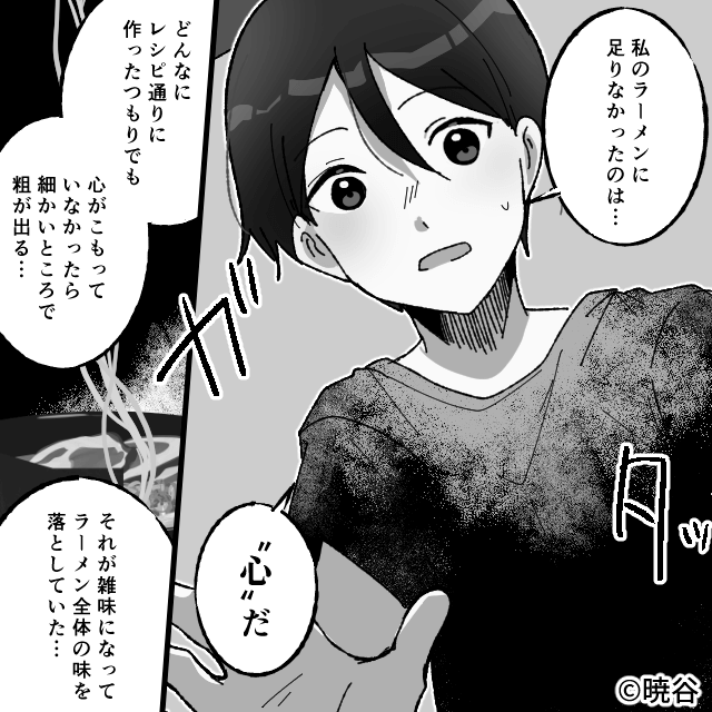 困り果てた主人公が父の遺したノートを見ると、そこには「味は心だ」と書かれていました。 その言葉を見て、今までは失敗が怖くて心を込められていなかったことに気づいた主人公。