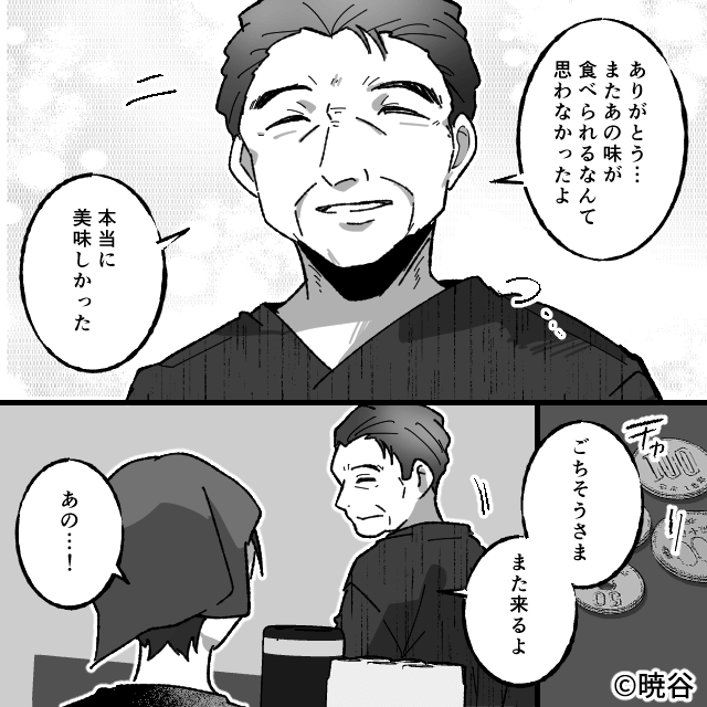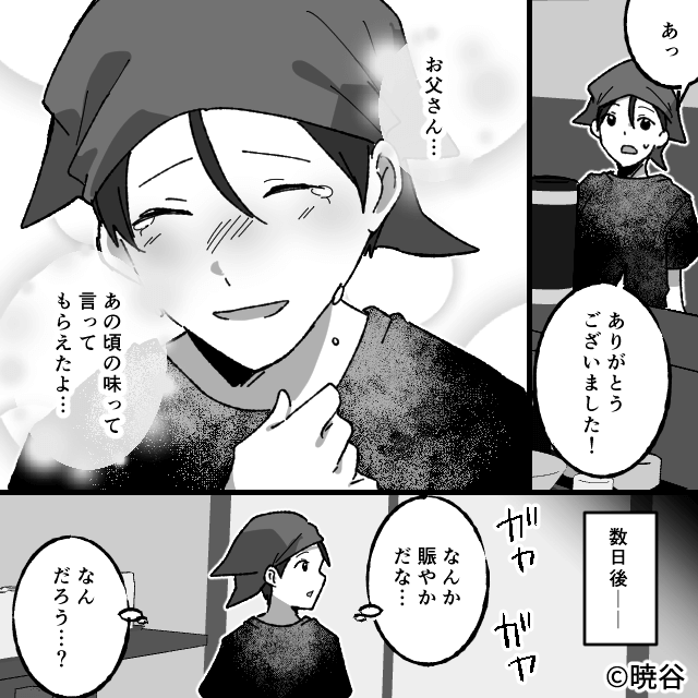 主人公が男性客に自信を持ってラーメンを提供すると、男性客は涙ぐみます。 男性客は幼いころから父のラーメンを食べてきた人で、主人公のラーメンを食べて「あのころと同じだよ」と言ってくれました。