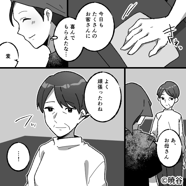 数日後、再び男性客が来店したため感謝をした主人公。 男性客は「あんなのはきっかけにすぎないよ」と言い、主人公のラーメンを褒めてくれます。