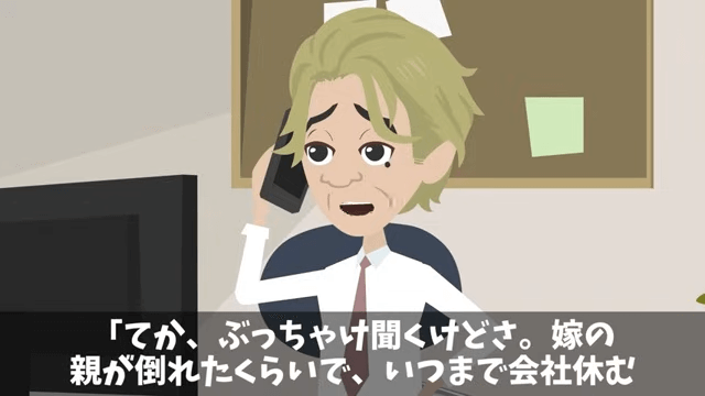 電話をかけてきた課長は「おっせーよ。マジで何してんの?」と主人公に言います。 さらに課長は「嫁の親が倒れたくらいで、いつまで会社休む気?なめてんのか?」と言ってきて…。