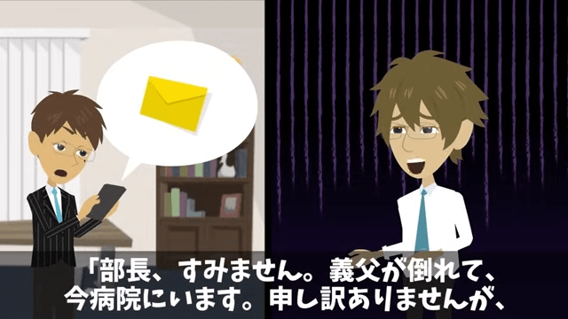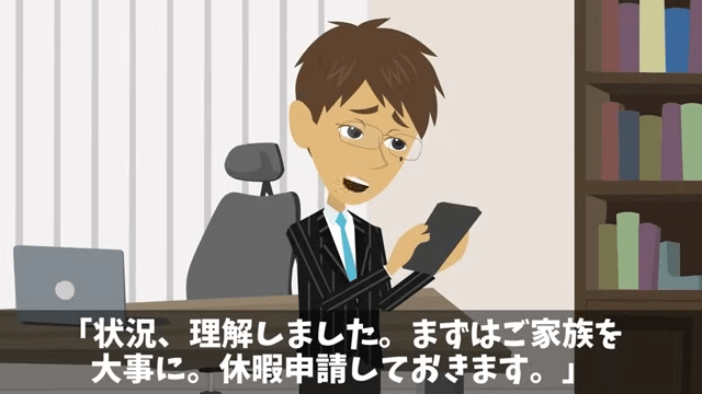 主人公はメールで部長に事情を説明し、しばらく出社は難しそうだと伝えました。 すると部長は「まずはご家族を大事に。休暇申請しておきます」とすぐに返事をくれたのです。