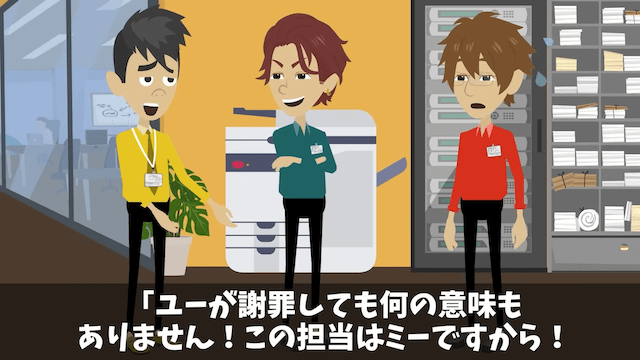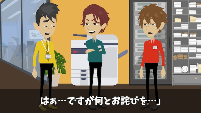 先輩に「ざっと数十万の損失…これはただでは済まないな」と言われた主人公は、謝罪をすると申し出ます。 しかし主人公が謝罪をしても意味がなく、男性社員は困り果てるのでした。