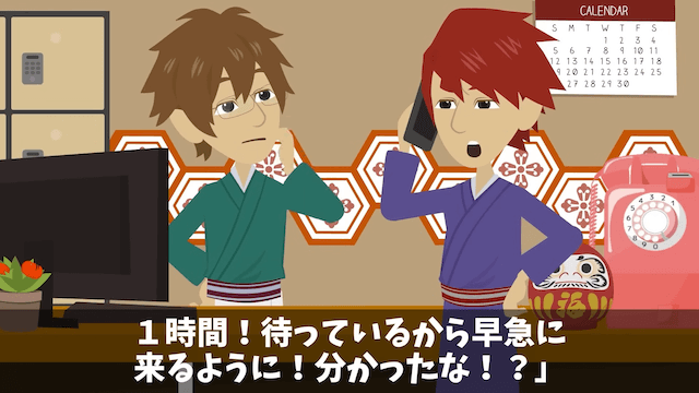 出張があると言って出かけ、サボりがバレないようスマホの電源を切っていた先輩。 上司に「とにかく早く来い!」と言われ、先輩は慌てて旅館に向かおうとします。