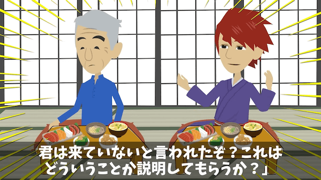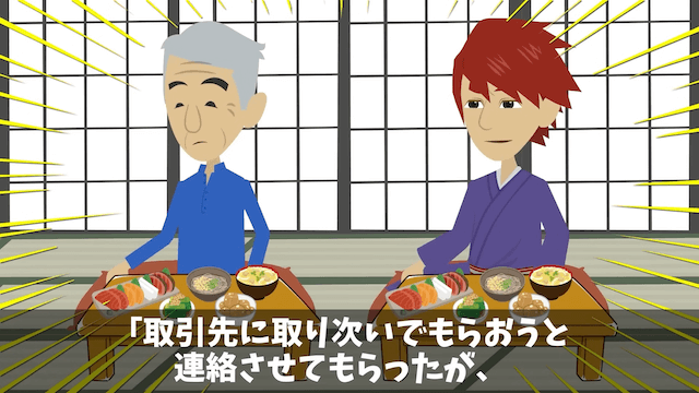 旅館に到着した先輩は、上司や社長から責められます。 上司は先輩に取り次いでもらうために取引先に連絡をしていたのですが、先輩はいないと言われていて…。
