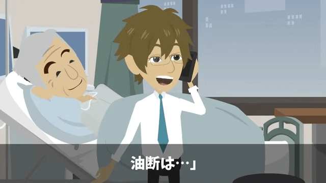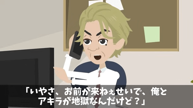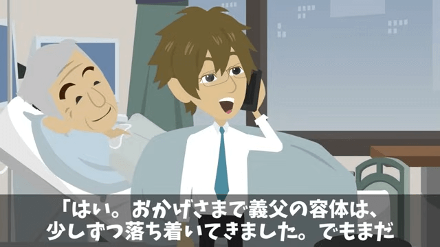 主人公が病室で義父たちと話していると、課長から電話がかかってきました。 そこで主人公が義父の容体が安定してきたことを伝えると、課長は「いやさ、お前が来ねぇせいで、俺たちが地獄なんだけど?」と言い…。