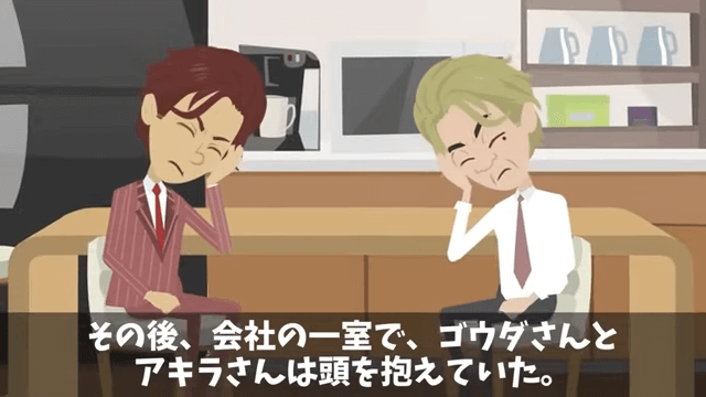 今回は『課長「義父の入院くらいで仕事を休むな!」俺「本当にいいの?」⇒義父の正体を明かした結果』を紹介します。 社長が今後の処理について伝えると、係長は「ま、待ってください、それは…」と食い下がりました。 しかし部長が話を終わらせてしまったため、係長は「終わった…」と頭を抱えます。