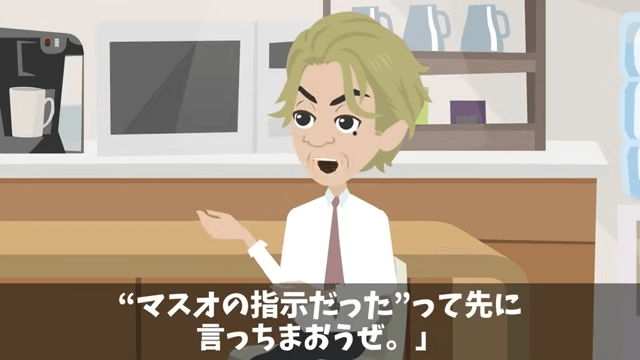 追い詰められた課長は、主人公の指示だったと先に言ってしまうことを思いつきます。 すると係長もそれに賛同するように、後輩に話を合わせるよう言えば大丈夫だと言って…。