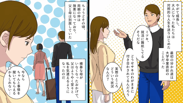 いつも母に叱られていた主人公は周りに落ちこぼれだと思われ、頼れる人もいませんでした。 しかし主人公が大学を卒業するころ、横暴な母が出ていったため、父は主人公を気遣ってくれるようになり…。