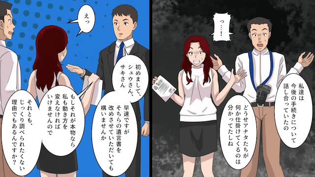 姉と夫は父が書いたという遺言書を見せつけてきて、主人公には遺産はないと言い張りました。 しかし主人公の相談相手である弁護士がその遺言書を見ようとすると、姉と夫は大焦り。