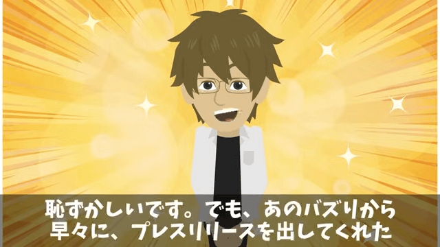 義姉は現場で主人公の評価が上がっていることを主人公に話しました。 それを聞いた主人公は、会社がすぐにプレスリリースを出してくれたおかげだと言い…。