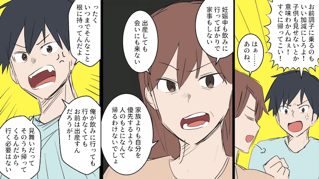 今回は『私「もうすぐ産まれる!今すぐ帰ってきて!」夫「急すぎだし会社の飲み会だから無理(笑)」⇒飲み会を優先した結果』を紹介します。 「子どもよりも飲み会を優先する人のいる家になんか帰らない」と夫に言い放った主人公。 すると夫は逆ギレし「今からお前の実家に行くからな!」と怒鳴ってきたのでした。
