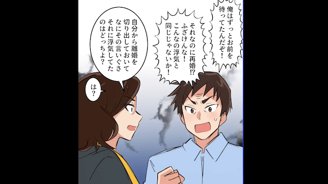 復縁を迫ってきた元夫に、再婚したことを伝えた主人公。 すると元夫は「こんなの浮気と同じじゃないか!」と怒り出します。