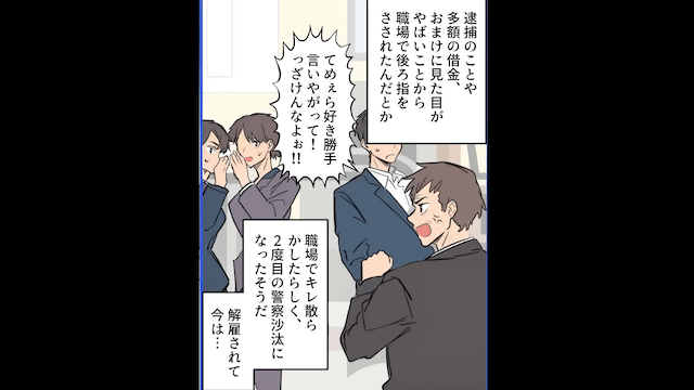 今回は『離婚して3年後…元夫「やっぱお前じゃないとダメだわ(笑)」「私もう再婚してるけど?」⇒勘違いしていた元夫の末路』を紹介します。 主人公に掴みかかったことで逮捕された挙句、借金も膨らんで苦しい生活を送ることになった元夫。 一方、浮気相手は支援者の男性とトラブルになり、その事件が全国ニュースになったのでした。
