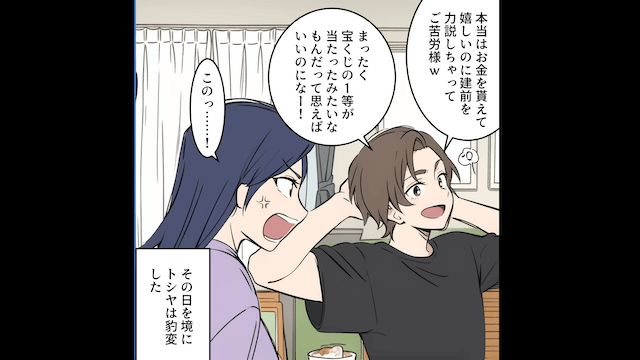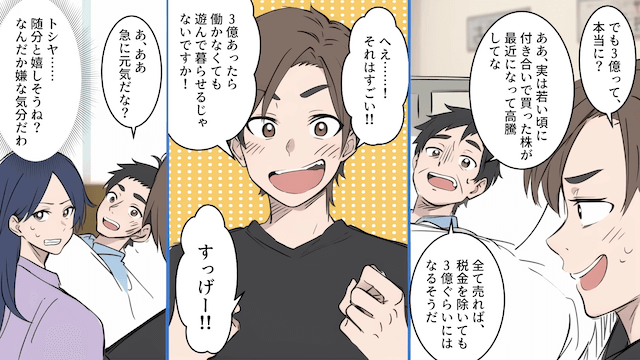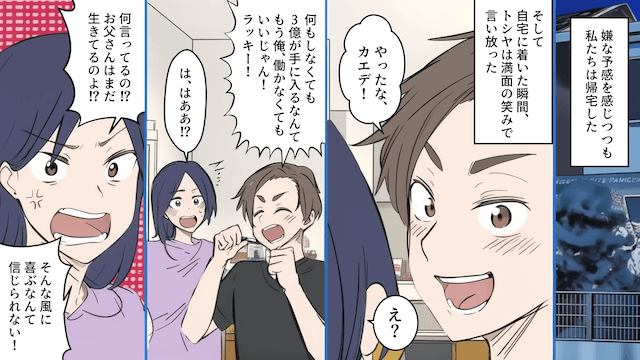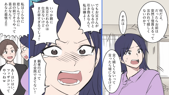 ある日、父が倒れたという連絡を受けて慌てて病院に行った主人公は、父から「3億円を遺す」と告げられます。 するとその話を聞いた夫が「もう俺働かなくてもいいじゃん!」と喜び、父の心配をする主人公の前で遺産の話ばかりしたのでした。