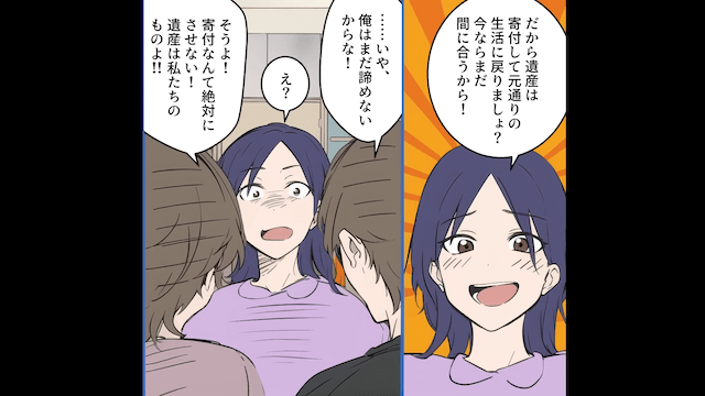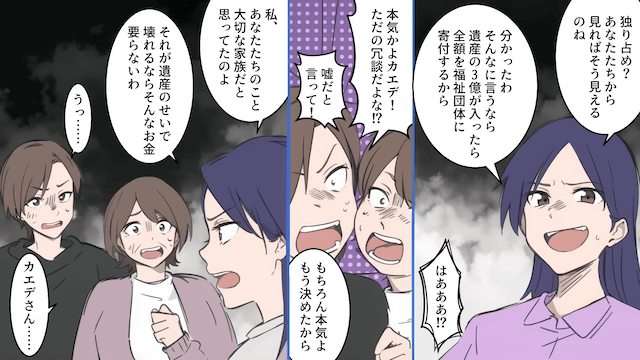 そんな2人の言動に激怒した主人公は遺産を寄付することに決めたのですが、2人は諦めてくれず…。